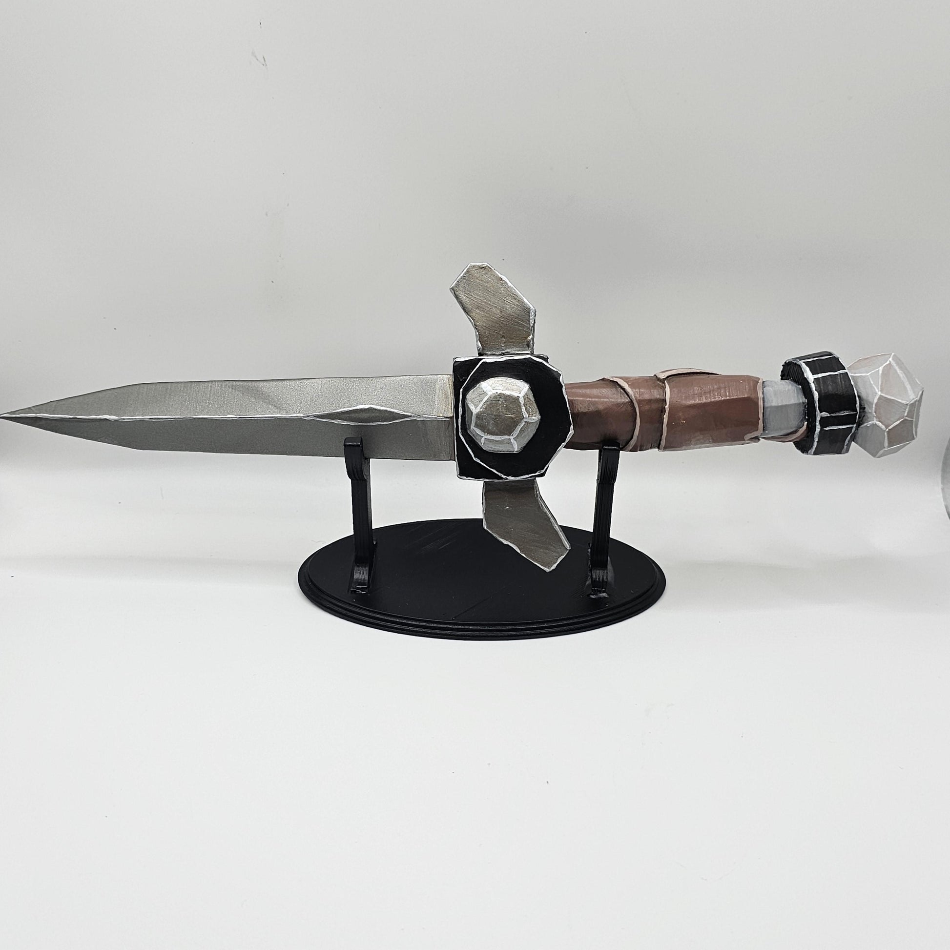 Each throwing knife ordered comes with a free stand to display them on! It can be displayed on a shelf safely and can also be used as a prop for a cosplay, as this item is 3D printed it is fragile and if used and swung around too much it can break. If used as a cosplay piece it should be cared for and NOT used as a toy or for LARPing. DO NOT THROW THEM! THEY ARE NOT REAL THROWING KNIFES.